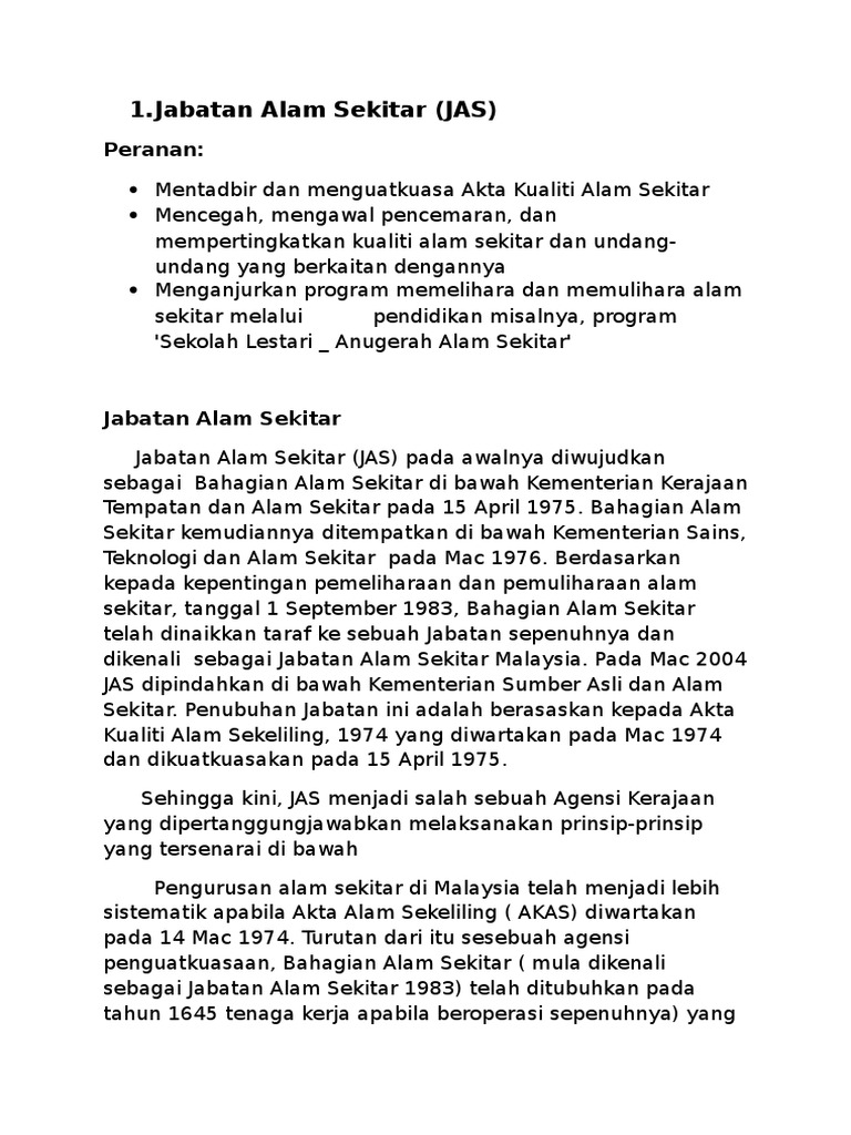 Dengan itu diharapkan pencemaran alam sekitar dapat diatasi dengan penguatkuasaan akta dan undang-undang alam sekitar. Permohonan Latihan Industri ePerkhidmatan Share on facebook Share on twitter Share on print Share on email MAKLUMAN. Jabatan Alam Sekitar JAS berkuasa untuk mendakwa pihak yang mencemarkan alam sekitar dan disyaki menjejaskan kualiti alam sekitar.